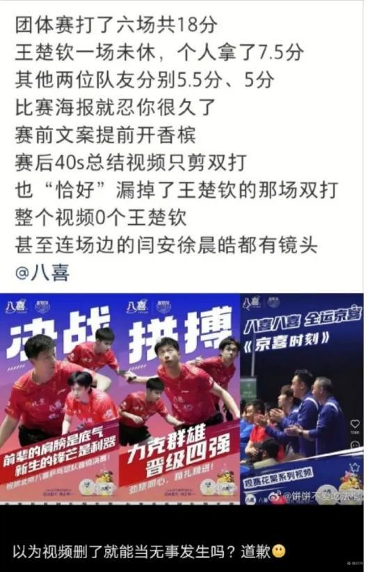 “王楚钦粉丝真的很宽容素质很高,男团海报一直弱化王楚钦都没说什么。但 40 秒的夺冠庆祝视频都没有贡献最大的王楚钦,做的太过分了 @八喜冰淇淋”