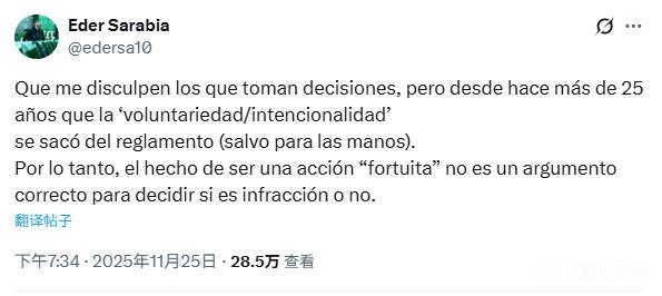 随后,埃德-萨拉维亚通过他的社媒回应了莫里恩特斯:“那些做决定的人请原谅我,但自从25年前‘故意/意图’被从规则中删除(除了手球外),因此,认为是‘偶然’事件并不是判断是否犯规的正确理由。”