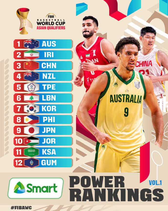 男篮世预赛亚大区实力榜:中国第三,澳大利亚第一,韩国第七