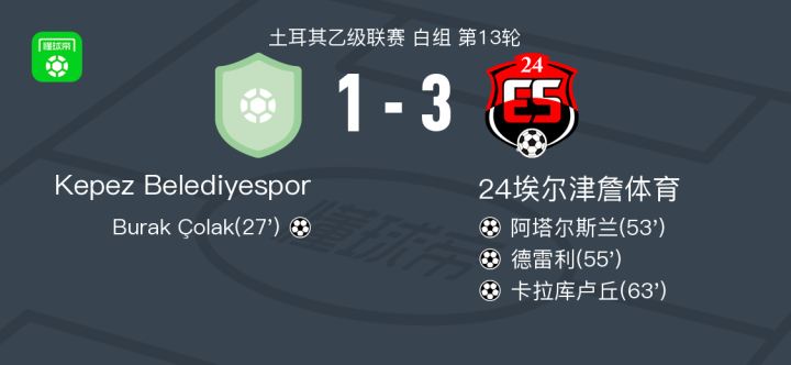 24埃尔津詹体育3-1逆转Kepez Belediyespor,卡拉库卢丘建功,德雷利破门