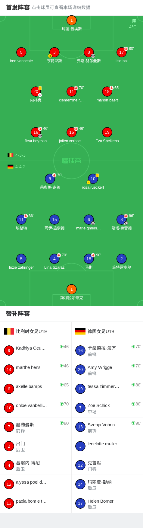 下半场补时第6分钟,比利时女足U19球员弗洛-赫尔曼斯打入一球。