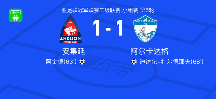 北京时间11月26日亚足联冠军联赛二级联赛 小组赛 第5轮,安集延对阵阿尔卡达格。安集延阿金德破门。阿尔卡达格迪达尔-杜尔德耶夫破门。最终比分安集延 1-1 阿尔卡达格。