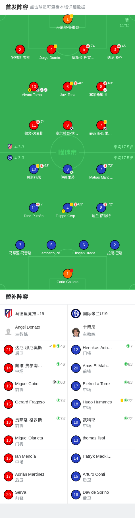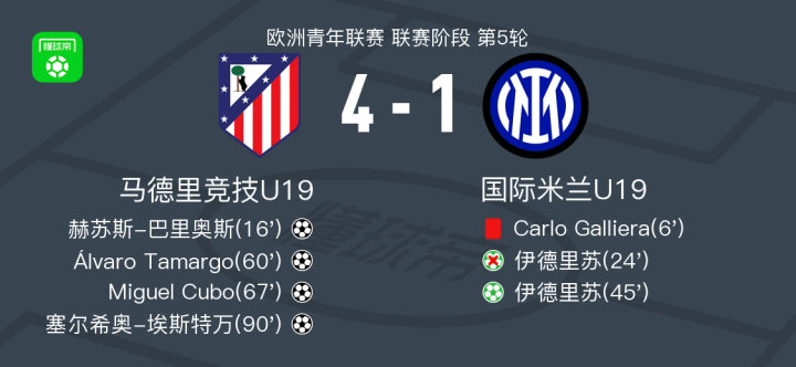北京时间11月26日欧洲青年联赛 联赛阶段 第5轮,马德里竞技U19对阵国际米兰U19。马德里竞技U19赫苏斯-巴里奥斯破门,Álvaro Tamargo破门,Miguel Cubo破门,塞尔希奥-埃斯特万破门。国际米兰U19伊德里苏破门。最终比分马德里竞技U19 4-1 国际米兰U19。