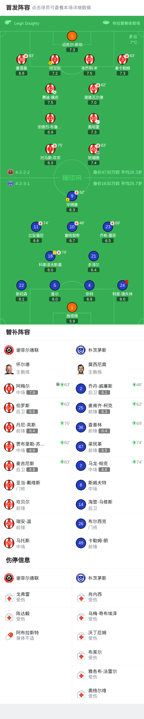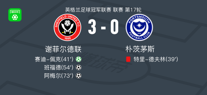 谢菲尔德联3-0大胜朴茨茅斯,阿梅尔、班福德破门