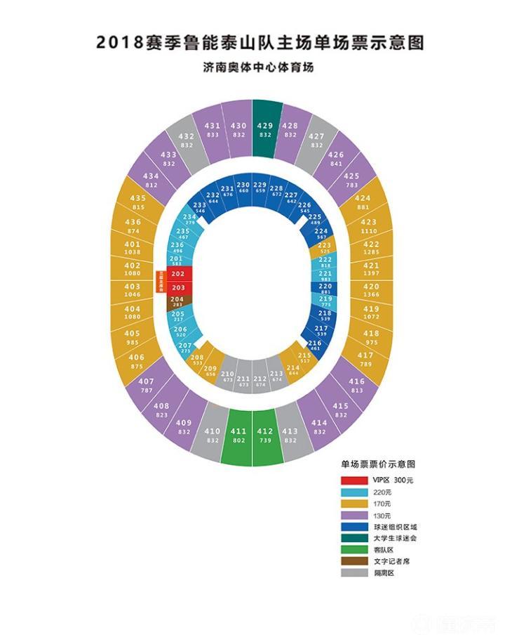 目前我懂也和官方同时开售了本场比赛的球票,本次单场球票不予售卖,需要同时购买山东鲁能vs北京国安和山东鲁能vs重庆斯威两场比赛的球票。联票价格分别为:130元,170元和220元三档。价格对应票区图如下: