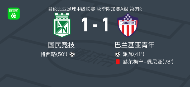 北京时间11月27日,哥伦比亚足球甲级联赛秋季附加赛A组第3轮,国民竞技主场迎战巴兰基亚青年。比赛中,巴兰基亚青年由派瓦接埃纳莫拉多助攻率先破门。随后,国民竞技由特西略在卡多纳的助攻下扳平比分。下半场后段,巴兰基亚青年球员赫尔梅宁-佩尼亚被红牌罚下。常规时间结束,双方1比1战平,比赛进入加时赛。