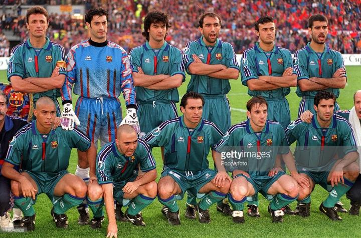 再来说说另一支欧洲豪门巴塞罗那,可能大家认识巴塞罗那的时候,这只球队穿的就是kappa的球衣,不知道为什么,就是那么牛,1994年的巴萨梦一队,巨星云集,罗马里奥,斯托伊奇科夫,科曼等球星,称霸西甲还杀入了欧冠决赛,虽然穿着kappa被米兰屠杀,但不就后外星人罗纳尔多的到来又让巴萨成为世界的焦点,1997年欧洲优胜者杯,巴萨又一次战胜巴黎夺冠,当时的鸟叔也穿着kappa的出场服。