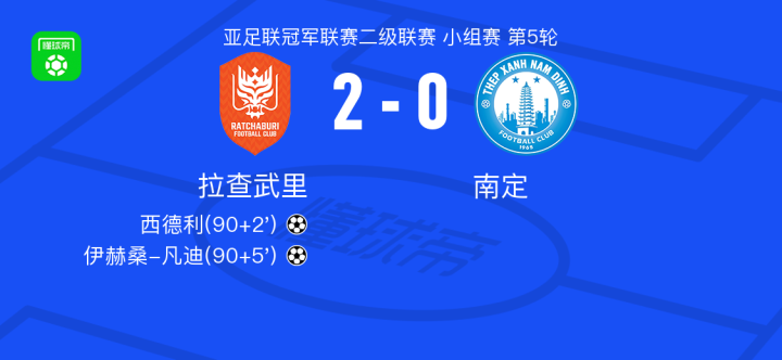 北京时间11月27日,亚足联冠军联赛二级联赛小组赛第5轮,拉查武里与南定展开较量。下半场补时阶段,拉查武里率先打破僵局,西德利攻入一球。随后,楚提巴送出助攻,伊赫桑-凡迪接应破门,进一步扩大领先优势。最终,拉查武里以2:0战胜南定。