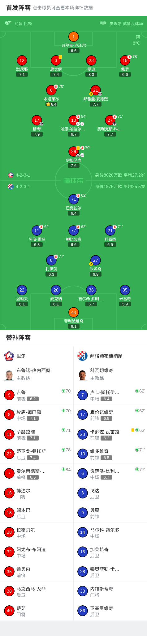 里尔4-0大胜萨格勒布迪纳摩,邦雅曼-安德烈建功,伊加马内1射1传