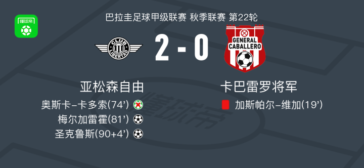 北京时间11月28日,巴拉圭足球甲级联赛秋季联赛第22轮,亚松森自由坐镇主场迎战卡巴雷罗将军。比赛中,卡巴雷罗将军球员加斯帕尔-维加被红牌罚下。随后,亚松森自由获得点球机会,但奥斯卡-卡多索主罚未能命中。比赛进入尾声阶段,弗雷特斯送出助攻,梅尔加雷霍破门为球队首开纪录。伤停补时阶段,圣克鲁斯再入一球,锁定胜局。最终,亚松森自由以2比0战胜卡巴雷罗将军。