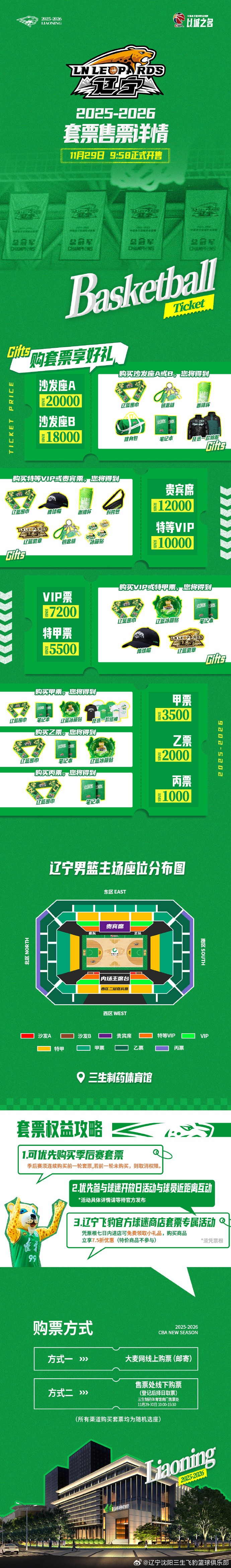 北京时间11月27日,辽宁男篮官方公布了2025-2026赛季CBA常规赛的主场套票售票方案。