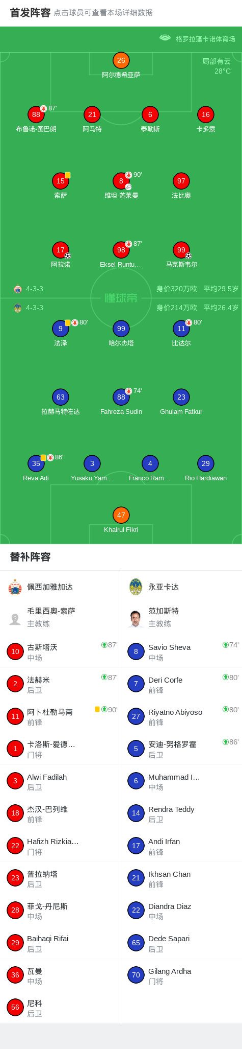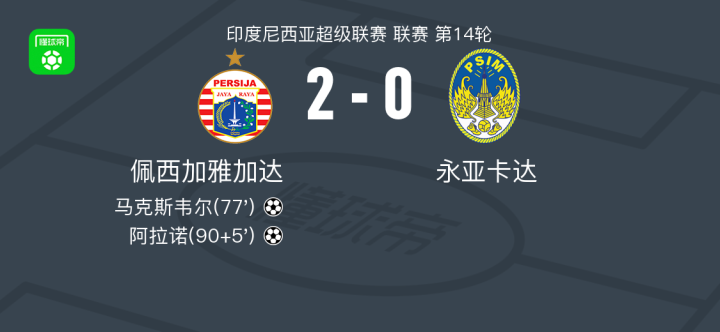 北京时间11月28日印度尼西亚超级联赛 联赛 第14轮,佩西加雅加达主场对阵永亚卡达。佩西加雅加达马克斯韦尔破门,阿拉诺破门。最终比分佩西加雅加达 2-0 永亚卡达。