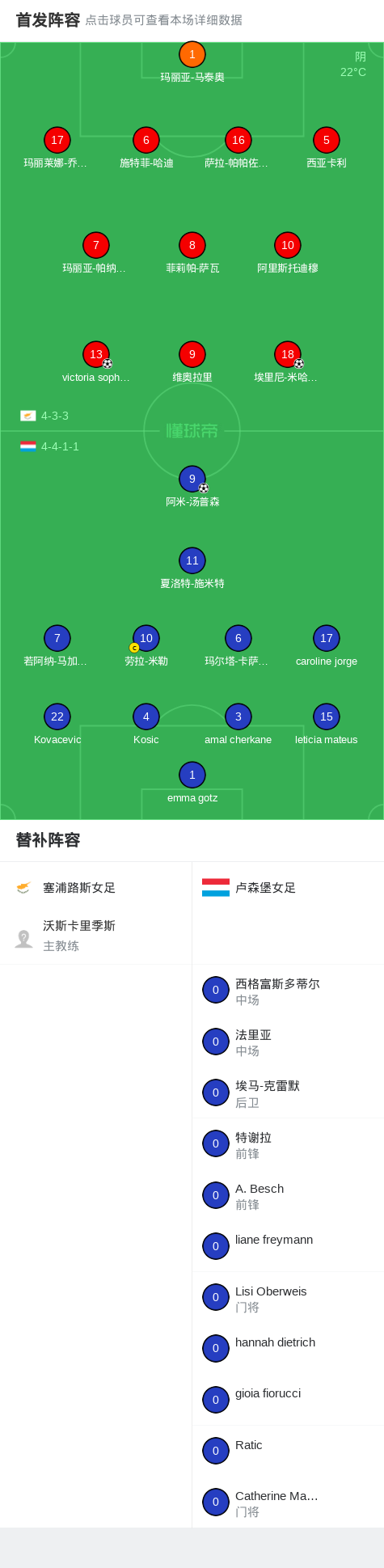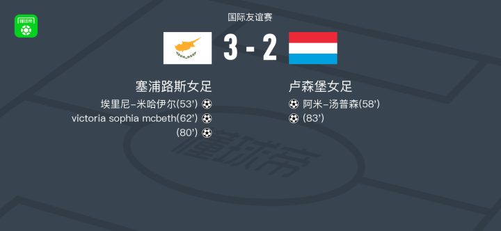 北京时间11月28日国际友谊赛,塞浦路斯女足对阵卢森堡女足。塞浦路斯女足埃里尼-米哈伊尔破门,victoria sophia mcbeth破门。卢森堡女足阿米-汤普森破门。最终比分塞浦路斯女足 3-2 卢森堡女足。