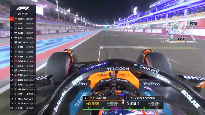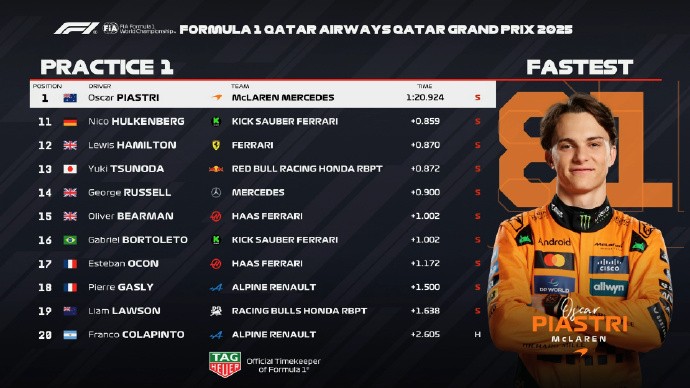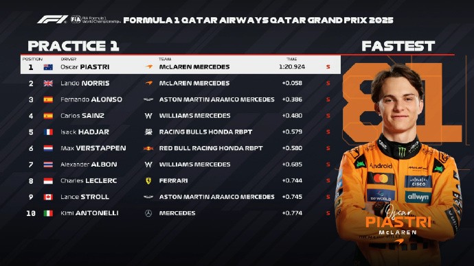 F1卡塔尔站一练:迈凯伦全场最快,阿隆索第3,维斯塔潘第6