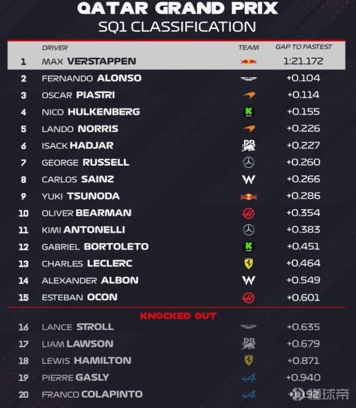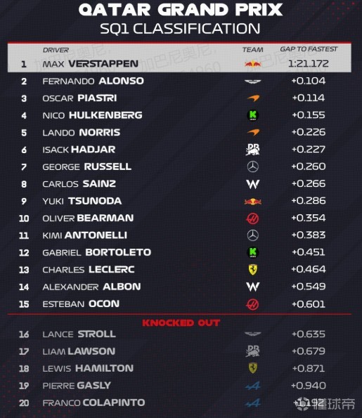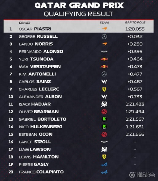 F1卡塔尔站冲刺排位排名