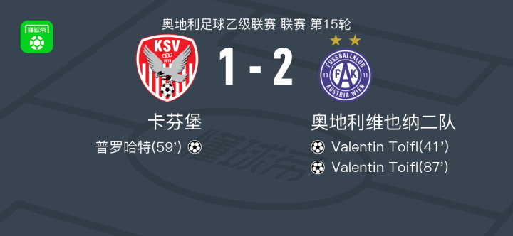 北京时间11月29日奥地利足球乙级联赛 联赛 第15轮,卡芬堡主场对阵奥地利维也纳二队。卡芬堡普罗哈特破门。奥地利维也纳二队Valentin Toifl梅开二度。最终比分卡芬堡 1-2 奥地利维也纳B队。