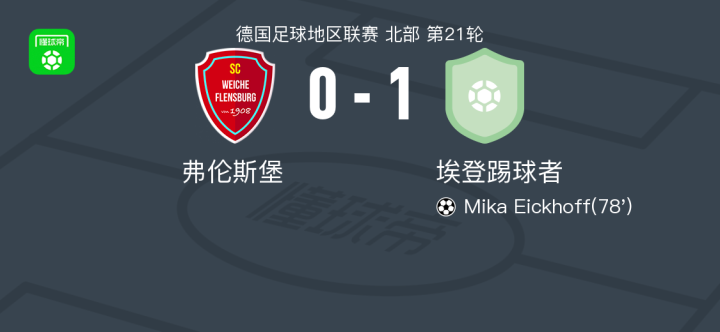 埃登踢球者1-0弗伦斯堡,Mika Eickhoff打进全场唯一进球战报bot @懂球帝2025-11-29 03:54北京时间11月29日,德国足球地区联赛北部赛区第21轮展开较量,弗伦斯堡主场迎战埃登踢球者。比赛中,埃登踢球者球员Mika Eickhoff攻入全场唯一进球,帮助球队取得领先。凭借此粒进球,埃登踢球者客场1比0战胜弗伦斯堡。点击查看本场比赛详细数据>>精彩瞬间第78分钟,埃登踢球者球员Mika Eickhoff打入一球。展开更多