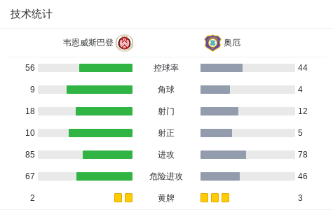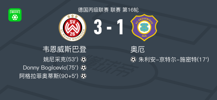 下半场补时第5分钟,韦恩威斯巴登球员格赖林格助攻阿格拉菲奥蒂斯打入一球。
