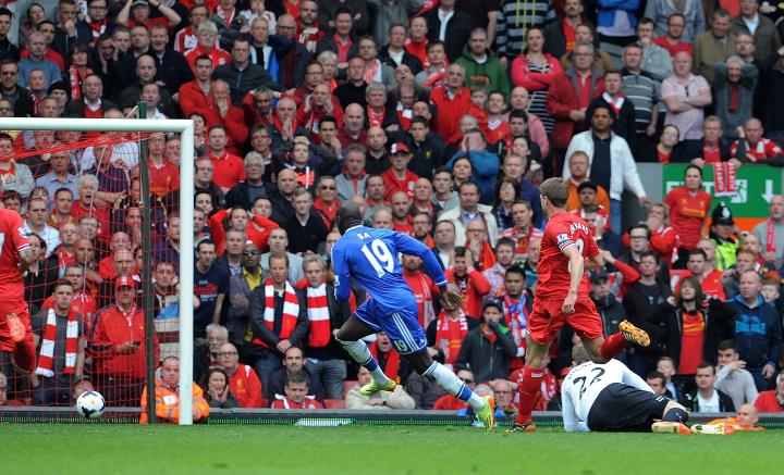 2014年4月27日,英超第36轮,利物浦主场0-2不敌切尔西。上半场最后时刻,杰拉德在无对抗状态下接球时突然滑倒,登巴巴笑纳大礼。利物浦失去争冠主动权,杰拉德也留下了没有英超冠军的遗憾。