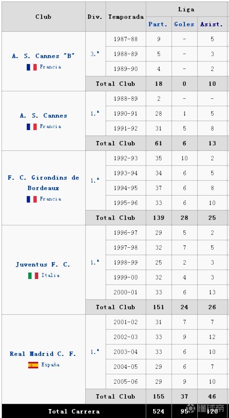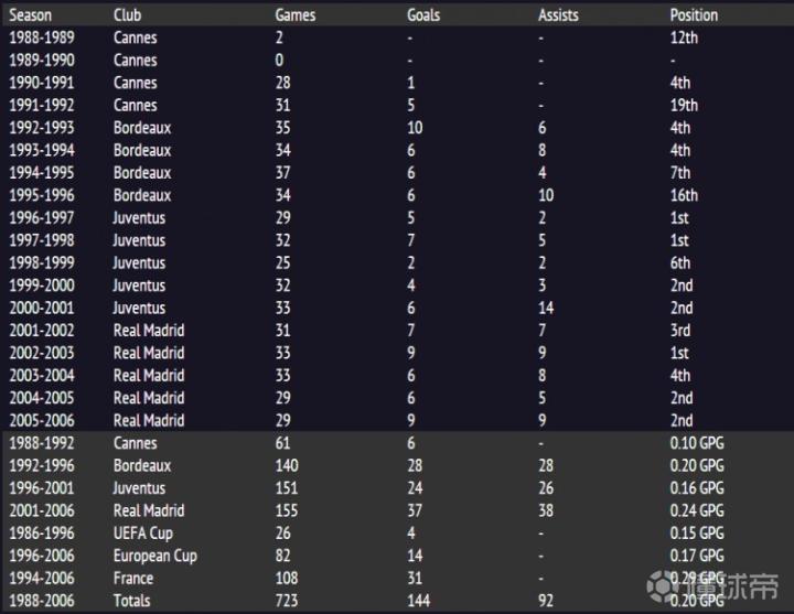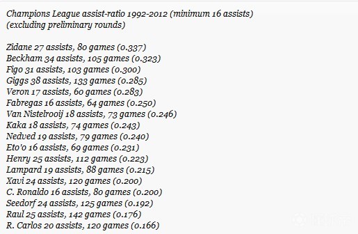 百度贴吧大神M君@怕砍不留名 统计 齐达内尤文图斯和皇马时期的助攻。