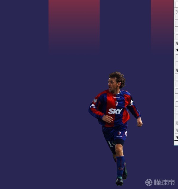 接下来如法炮制,把我比较喜欢的七名做出一定贡献的博洛尼亚球星(吉拉迪诺,曼奇尼,内尔沃,西格诺里,巴乔,莫莱奥和维尔迪)都贴在上面,为什么是七个呢?七象征博洛尼亚的七个联赛冠军。当然里面的很多具体参数要根据图片进行调整,比如叠加方式和透明度等参数,但总的来说是要做出一点磨砂和突出效果,结果如下: