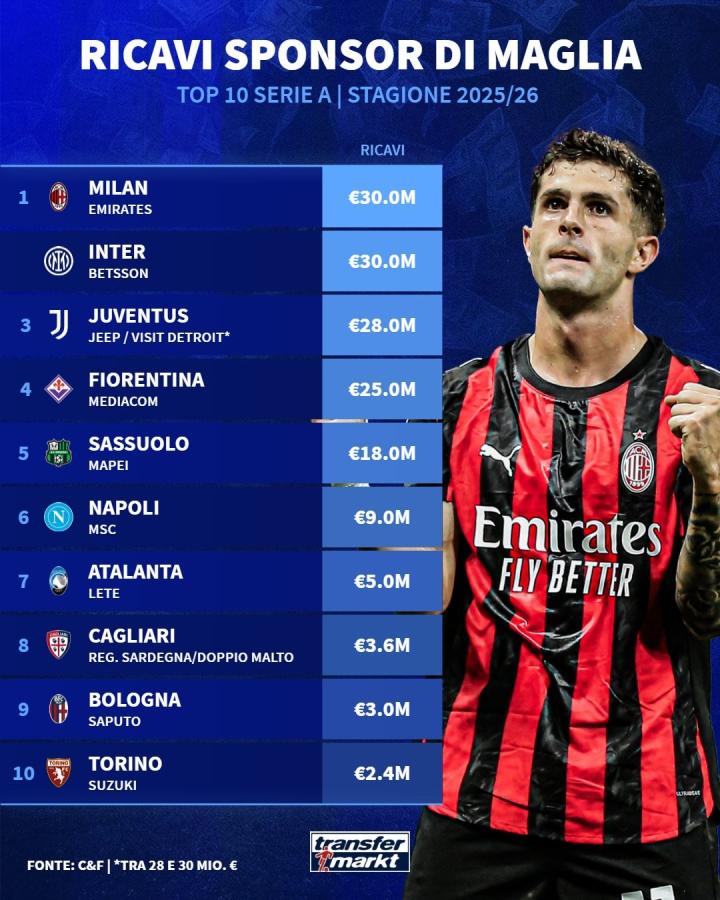 意甲俱乐部球衣胸前广告赞助费TOP10:米兰双雄3000万并列第1