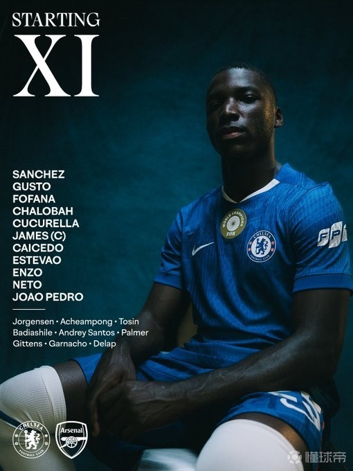 切尔西首发:1-罗伯特-桑切斯、27-古斯托、29-韦斯利-福法纳、23-特雷沃-查洛巴、3-库库雷利亚、24-里斯-詹姆斯、25-莫伊塞斯-凯塞多、41-埃斯特旺、8-恩佐-费尔南德斯、7-佩德罗-内托、20-若昂-佩德罗