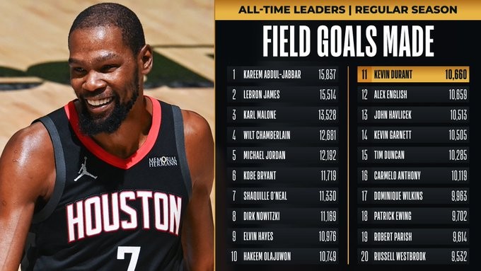 据统计,杜兰特的生涯总运动战进球数超越了第12位的英格利什,升至历史第11位。在他身前的是火箭传奇球星奥拉朱旺,后者的进球数为10749个。