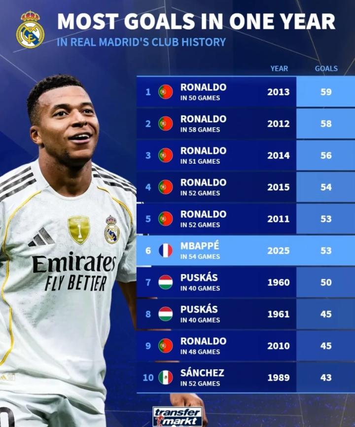 北京时间12月1日,德转统计出了皇家马德里俱乐部历史上自然年进球数TOP10,C罗6次上榜并且占据了前5位,2025年打进53球的姆巴佩则位列第6位。