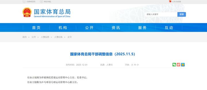 北京时间12月1日,国家体育总局网站发布干部调整信息,任命王励勤为乒乓球羽毛球运动管理中心副主任,任命占旭刚为举重摔跤柔道运动管理中心主任、党委书记。。