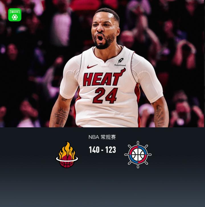 迈阿密热火诺曼-鲍威尔30分3板3助1断1帽,阿德巴约27分14板3助2断2帽,维金斯22分9板3助3帽;