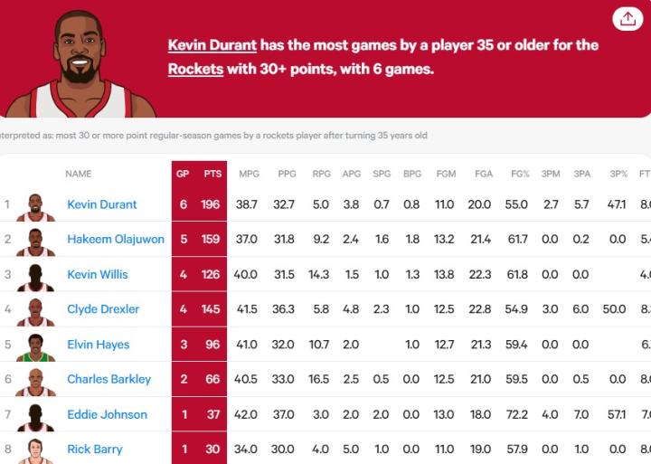 据统计,这是37岁的杜兰特火箭生涯第6场30+得分的比赛,他也成为了火箭队史上在35岁之后30+得分场次最多的球员。在火箭队史上共有8名球员曾在35岁后单场得到过30分,此前的记录保持者为奥拉朱旺,他曾在35岁后5次拿到30+。