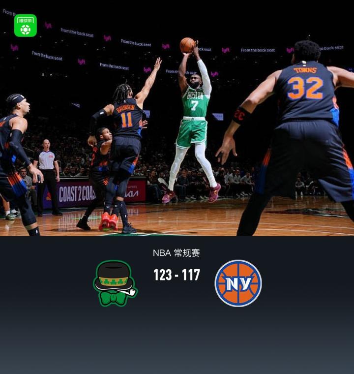 第四节凯尔特人德里克-怀特拿下7分,尼克斯米卡尔-布里奇斯拿下17分,最终凯尔特人123-117战胜尼克斯