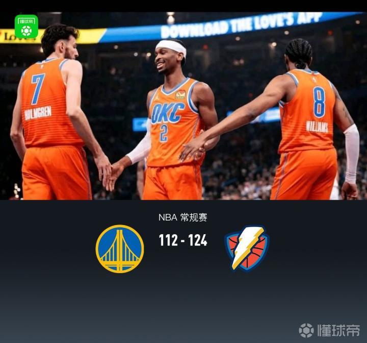 第四节,开节段勇士抓住亚历山大下场休息阶段,小佩顿、赛斯库里联手得分反超比分,随着格林三分再中领先4分,后半节亚历山大回来,勇士斯宾塞与亚历山大展开对飙,比赛来到关键时刻,勇士率先进攻断电,雷霆亚历山大连攻带传再度拉开分差锁定胜局,全场结束,雷霆124-11勇士。