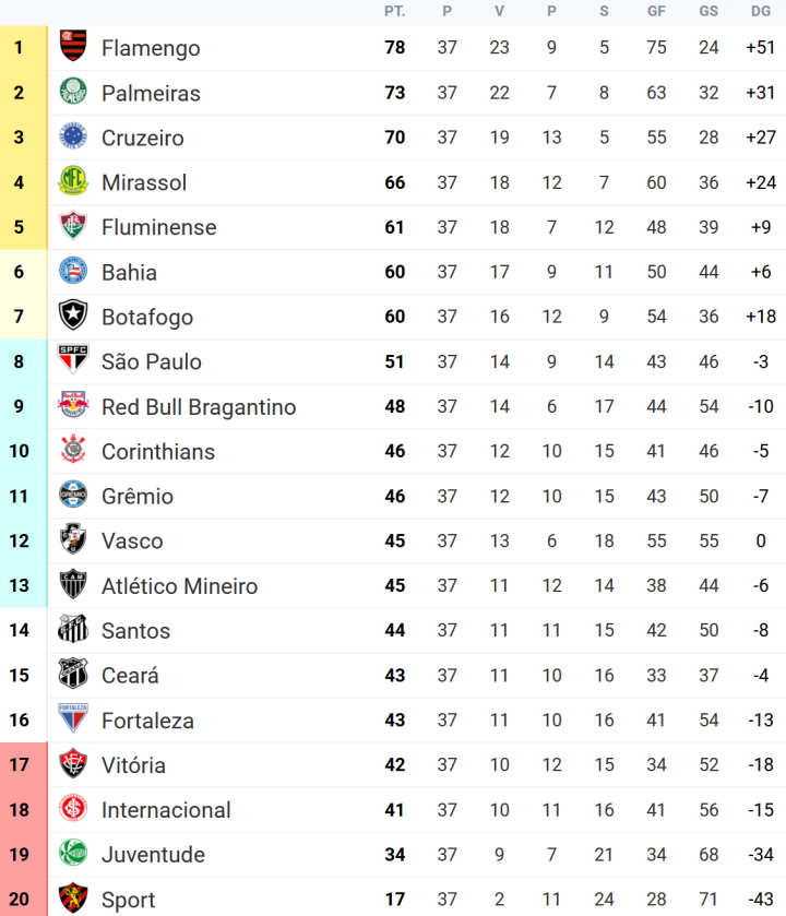 北京时间12月3日-12月5日,2025赛季巴西足球甲级联赛结束第37轮争夺。