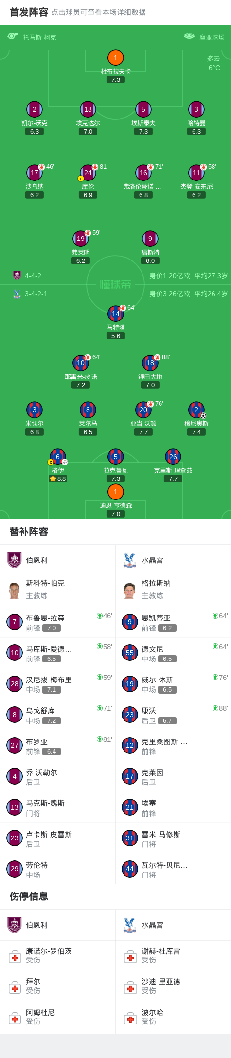 水晶宫客场1-0伯恩利,格伊助攻穆尼奥斯头球制胜