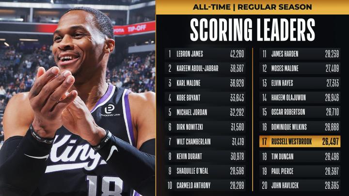 在上半场比赛中,威少8投3中得到了8分2篮板5助攻,他也在NBA历史总得分帮上超越了蒂姆-邓肯(26496分),升至历史得分榜第17位。