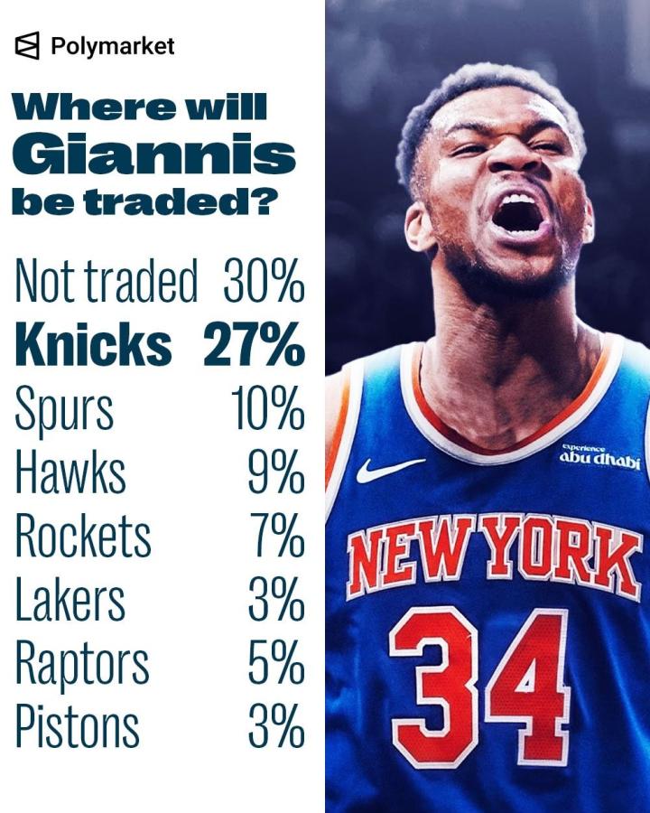 美国体育商业数据网站Polymarket就字母哥的下家归属进行了计算。其中,字母哥留队的概率为30%依然最高,但加盟尼克斯的概率也来到了较为接近的27%。此外,包括湖人在内的多支劲旅也都成为了潜在下家。