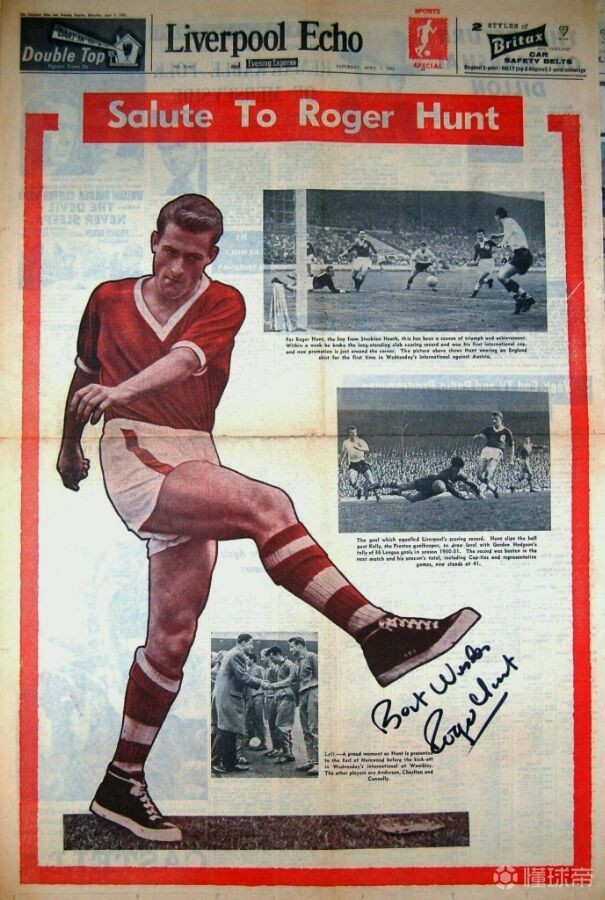 ▲1966年世界杯罗杰·亨特身穿的英格兰队球衣,如今收录在世界足球博物馆内。罗杰·亨特(1938-),职业生涯代表利物浦队攻入286球,在被伊恩·拉什超越前一度排名利物浦队史最佳射手。