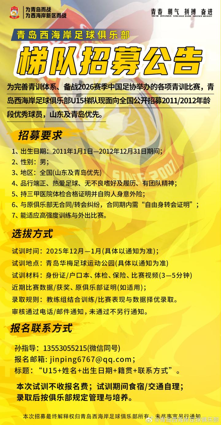 【招募】青岛西海岸足球俱乐部U15梯队招募公告