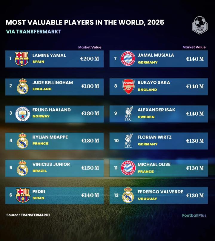 新一期身价排行榜:亚马尔领跑,穆西亚拉与奥利塞保持不变