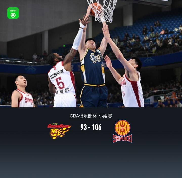 北京时间12月4日CBA俱乐部杯小组赛,广东东阳光对阵山西汾酒。首节山西便依靠诺威尔发挥建立两位数领先,半场广东51-58山西,下半场广东反扑一度反超比分,但随后山西稳住局面再度拉开分差,最终山西106-93广东。