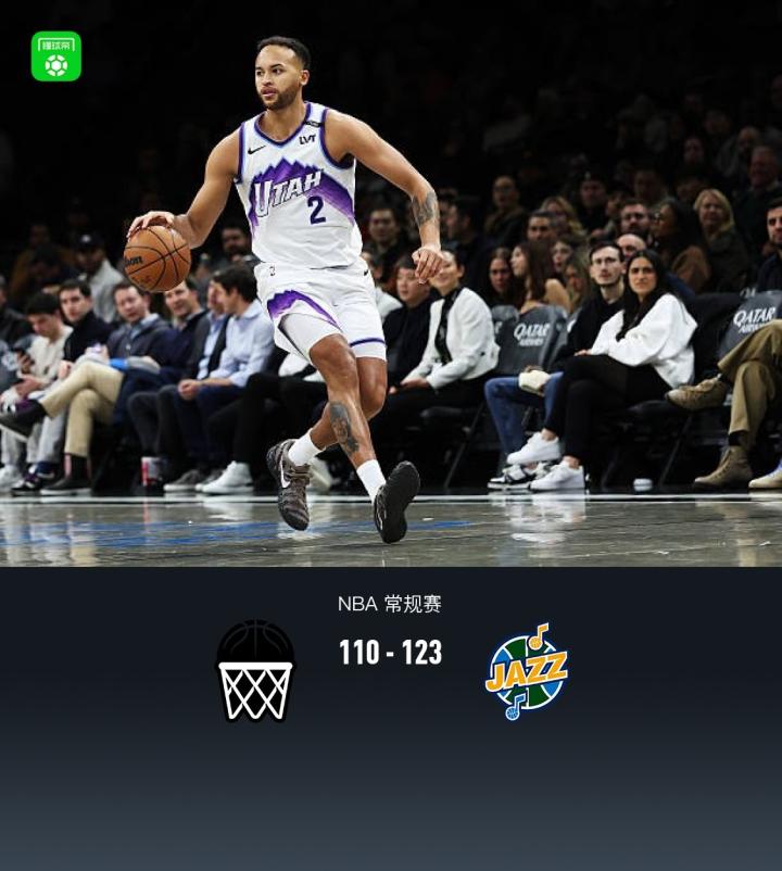 第四节篮网扎伊尔-威廉姆斯拿下7分,爵士马尔卡宁拿下10分,最终篮网110-123不敌爵士