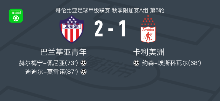 巴兰基亚青年2-1逆转卡利美洲,迪迪尔-莫雷诺、赫尔梅宁-佩尼亚建功