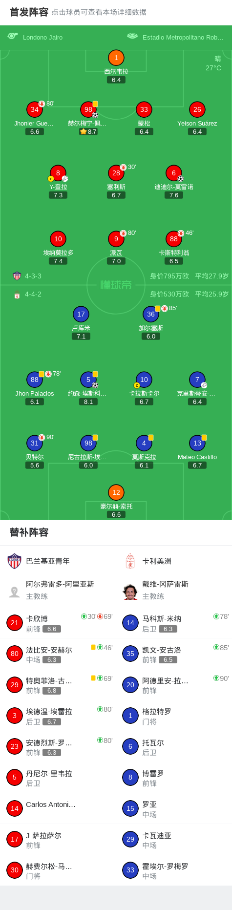 第68分钟,卡利美洲球员克里斯蒂安-巴里奥斯助攻约森-埃斯科瓦尔打入一球。