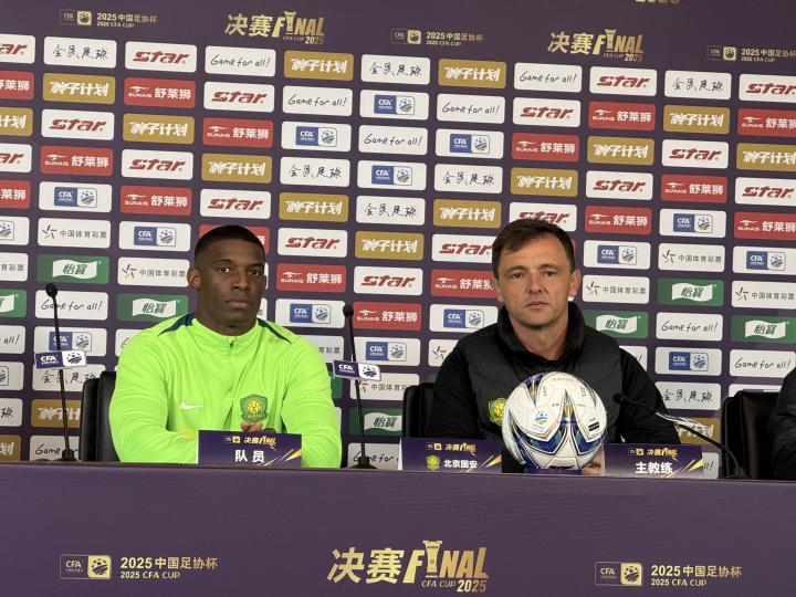 北京时间12月5日,2025中国足协杯决赛赛前新闻发布会在苏州奥体中心举行。北京国安主教练拉米罗携球员法比奥出席。