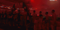 在里斯本光明球场的红色灯光下双方球员入场,比赛马上开始
