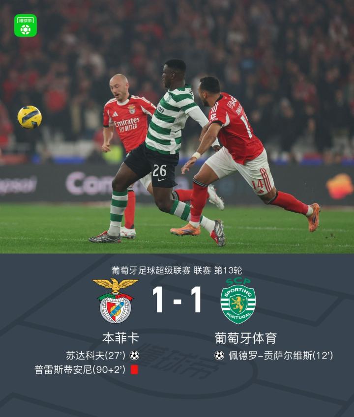 北京时间12月6日,葡萄牙足球超级联赛第13轮展开较量,本菲卡坐镇主场迎战葡萄牙体育。上半场,葡萄牙体育率先打破僵局,佩德罗-贡萨尔维斯接莫滕-尤尔曼德助攻取得进球。随后本菲卡展开反击,苏达科夫在德迪奇的助攻下成功破门,帮助球队扳平比分。下半场补时阶段,本菲卡球员普雷斯蒂安尼被红牌罚下。最终全场比赛结束,双方以1比1握手言和。