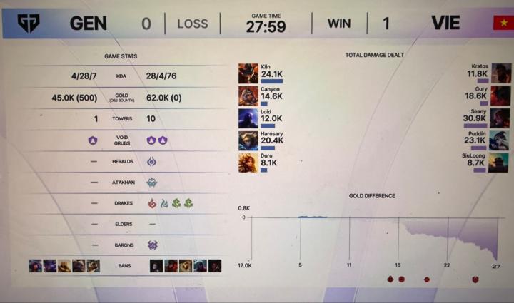 本次比赛,GEN派出了主力上野辅Kiin/Canyon/Duro,中路和AD则是青训选手。结果他们接连惨败,第一场人头比6-24不敌C9,第二场人头比4-28不敌越南代表队,遭遇开门两连黑。尤其是在对阵越南的比赛中,GEN上单Kiin甚至遭到了对位单杀。