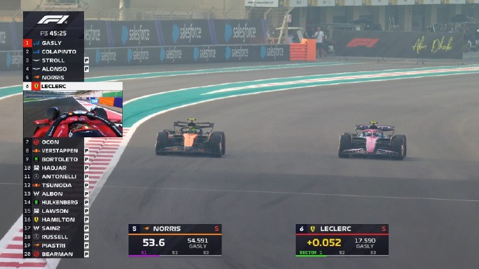 北京时间12月6日,F1阿布扎比大奖赛第三节练习赛也是赛季最后一场练习赛结束。拉塞尔全场最快,诺里斯第2,维斯塔潘第3,阿隆索第4,皮亚斯特里第5,奥康第6,贝尔曼第7,勒克莱尔第8,安东内利第9,阿尔本第10。